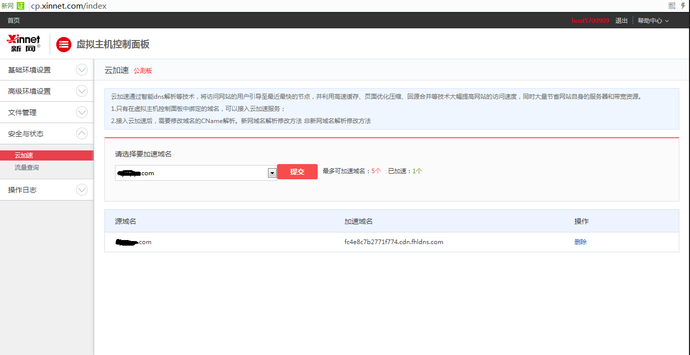 1. 登錄cp.xinnet.com,選擇“安全與狀態(tài)”,選擇“云加速”;
